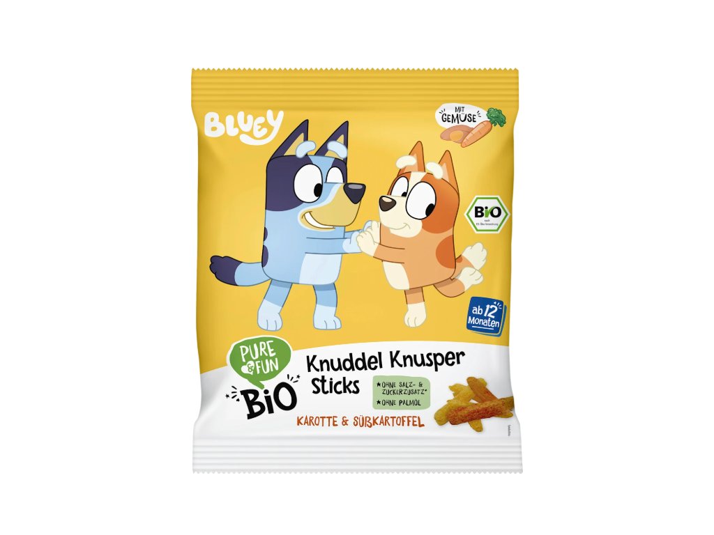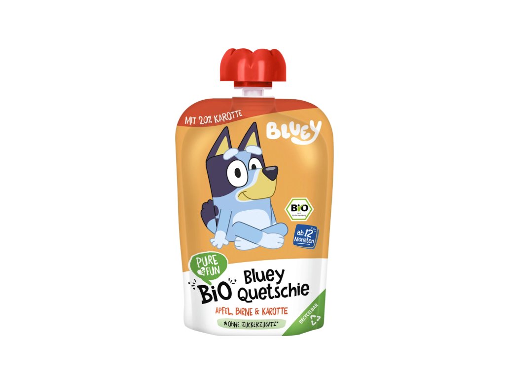 ovocný sáček Bluey s jablkem, banánem a mrkví od PURE&FUN, vhodný pro miminka od 12 měsíců, je ideálním společníkem pro malé dobrodruhy. Kombinace ovocného jablka, sladkého banánu a osvěžujícího nádechu mrkve vytváří lahodný chuťový zážitek. Pyré získává svou sladkost výhradně z bio ovoce, protože je vyrobeno bez přidaného cukru (obsahuje přirozeně se vyskytující cukry) a konzervantů. Balený v praktickém stlačitelném sáčku je tato ovocná a zeleninová svačinka ideální na cesty.