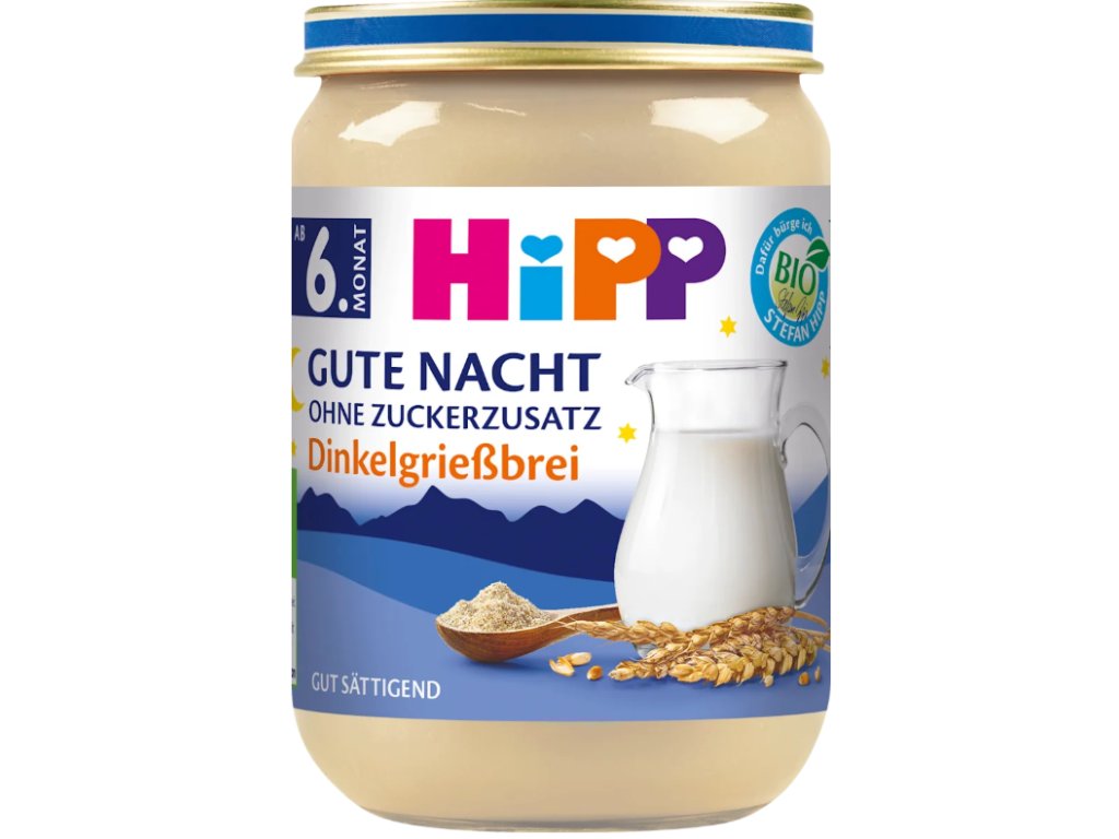 Večerní kaše Hipp Kaše na dobrou noc špaldová krupice v osvědčené bio kvalitě bez přidaného cukru*, je velmi sytá a je plnohodnotným jídlem. Obsahuje vápník, vitamín A, vitamín D a vitamín B1. Špalda je prastaré zrno, které se pro tuto sklenici mele na jemnou krupici.